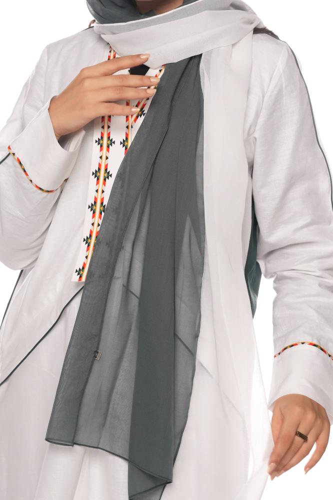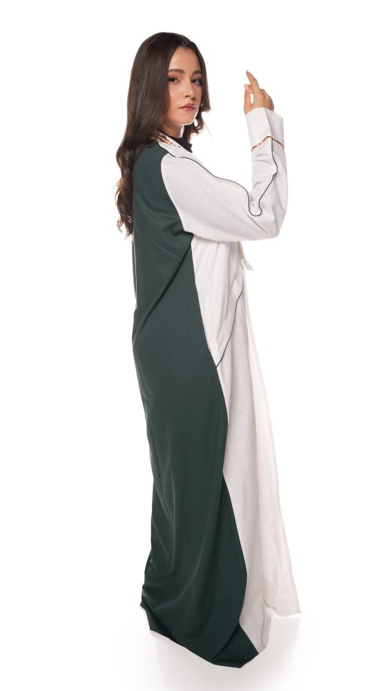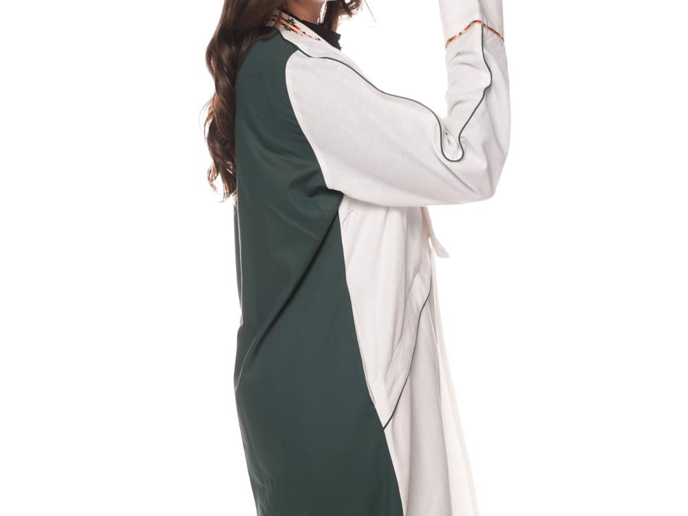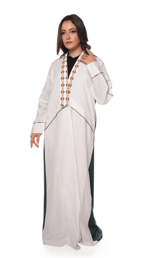 عباية لينن بيضاء بتصميم عصري من لومار ذات مظهر أنيق وبسيط. تتميز بتصميمها الفضفاض وقماش اللينن في الأمام والخلف مع لمسات باللون الأخضر الملكي تمنح العباية فخامة مميزة مع إكسسورات خاصة بنقوش تراثية ملونة. عباية للصبايا تناسب الخروجات اليومية لتتألقي كل يوم من دون أي قيود.