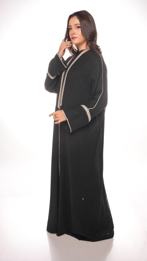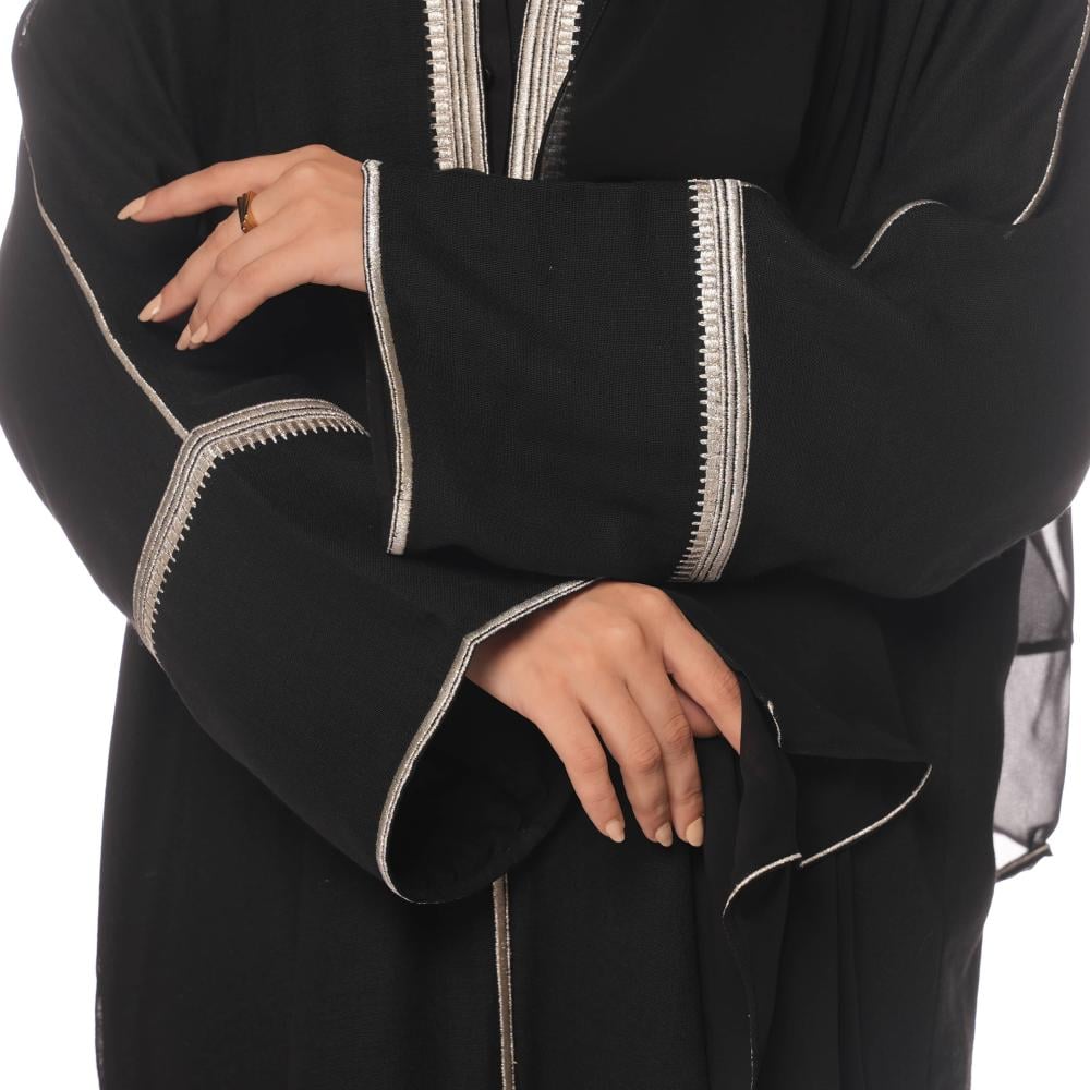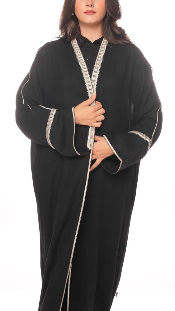 عباية مشلح أوكيجين من لومار. مصنوعة من قماش المشلح لون أسود ومبطنة بالشيفون البارد لضمان التهوية والراحة خلال لبسها، عليها تطريزات بالقصب الفضي على الجزء الأمامي والأكمام تمنحها مظهراً ملكياً فاخراً. عباية ملكية للمناسبات الرسمية والخاصة.