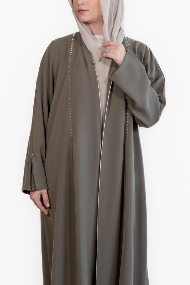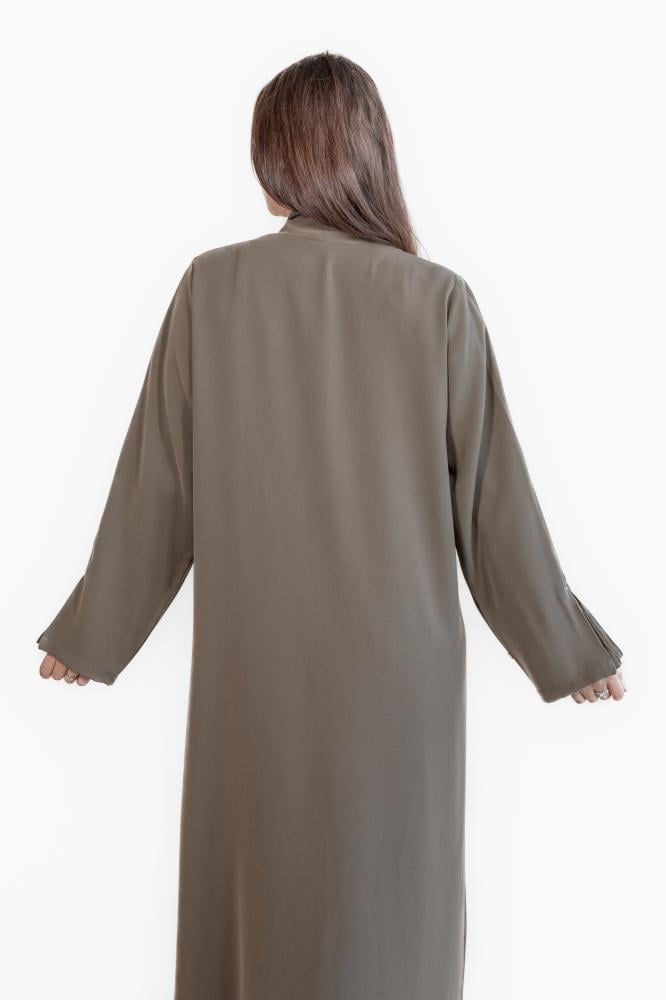 Casual Night Abaya in olive green from Lomar. A modern abaya made of luxurious crepe with a loose fit that drapes smoothly and lightly over your body, giving you striking feminine elegance and a strong presence wherever you go. An elegant abaya for work, university, and casual and formal visits.